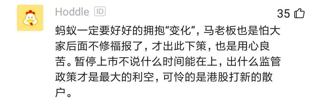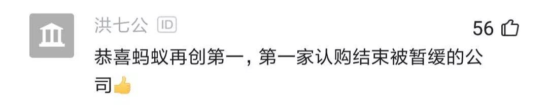 还有人恭喜蚂蚁再创第一,成为第一家认购结束被暂缓上市的公司。这个“第一”,估计谁都不想当……