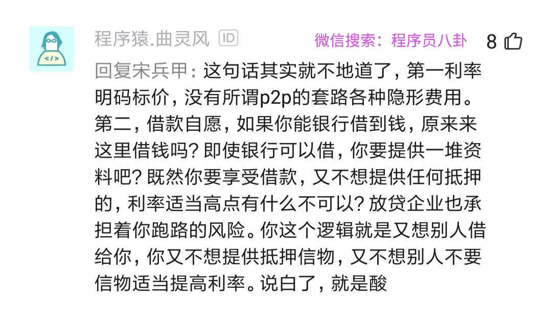 不过也有人说,这么说话就不地道了。第一借款利率明码标价,没有p2p的套路;第二,借款自愿;第三,既然要享受借款,又不想提供任何抵押,利率高点就不应该不乐意。放贷企业也承担着你跑路的风险,怎么能又享受借款便利,又不愿意承受高利率,哪有这种好事?