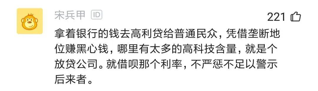 人说蚂蚁拿银行的钱去高利贷给普通民众,凭借垄断挣黑心钱,根本不是什么高科技公司,不惩不足以警示后来者。