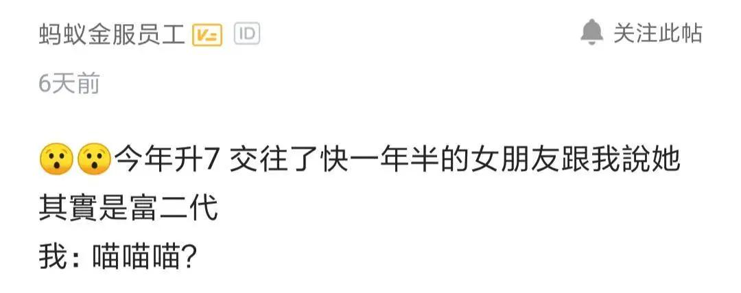 最后,让我们把时间倒回六天前,那时一个蚂蚁金服的程序员还兴致勃勃地发帖说自己今年升p7,又得知交往一年半的女朋友是个富二代。