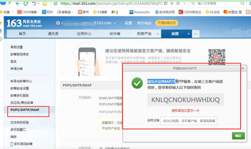使用xxx@163.COM邮箱,获取授权密码:XLQCNKUHWHIXJQ ,不同的邮箱生成的不一样