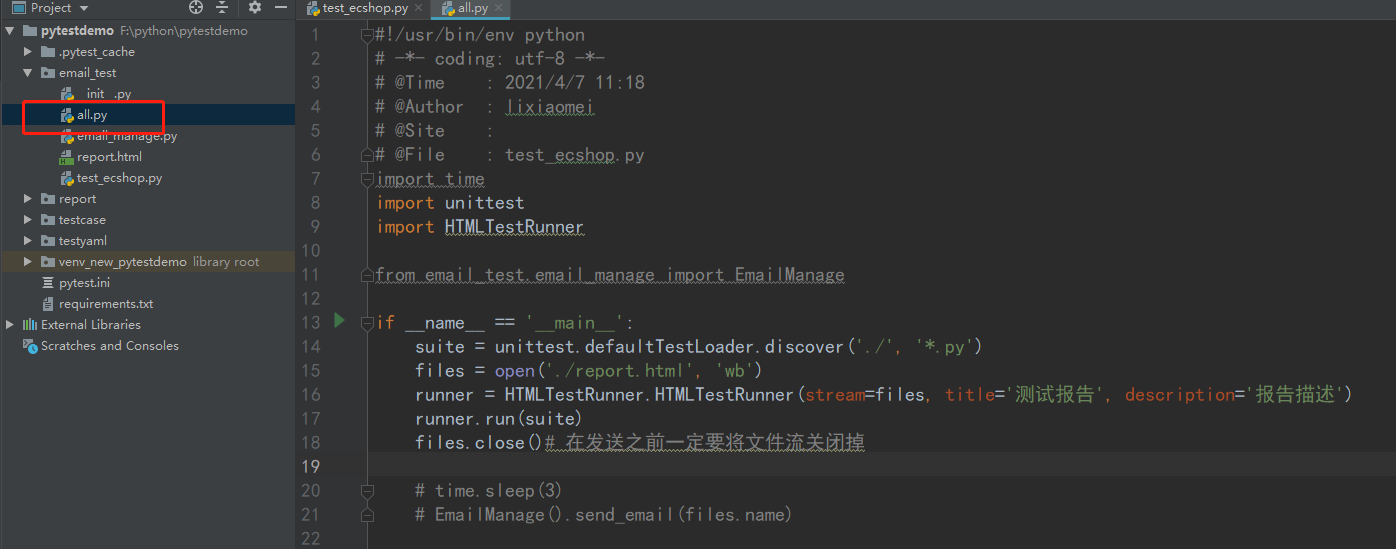 runner = HTMLTestRunner.HTMLTestRunner(stream=files, title='测试报告', description='报告描述')