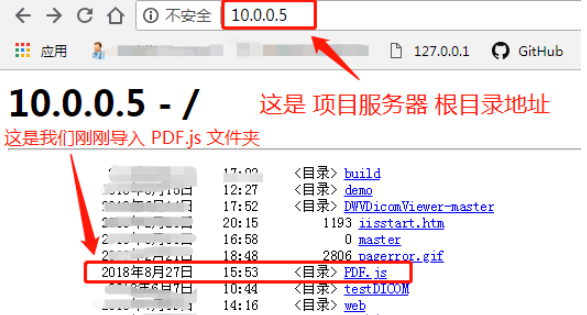 2.当 你访问 项目 服务器 根目录(10.0.0.5) 能够 看到 PDF.js 这个文件夹 说明 这一步已经完成了