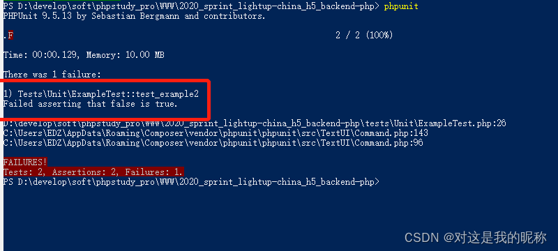 当现实小绿条的时候就意味着测试通过了,咱们再来看看失败的例子,咱们在ExampleTest.php中新增一个方法test_example2: