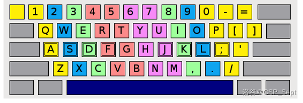 有很多网站教你正确打字。下图描述了基本原理:用同一个指针按所需的键是同一颜色的。黄色键需要用小指按下,蓝色键需要用无名指,绿色键需要用中指,红色键需要用食指。自然,左手按键盘的左侧(从