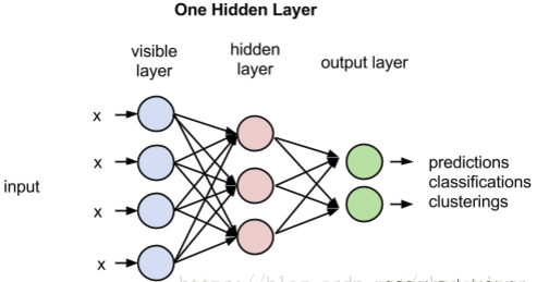输入层(input layer)由简单的输入人工神经元构成。每个输入神经元至少连接一个隐藏层(hidden layer)的人工神经元。隐藏层表示潜在的变量,它输入和输出都不会出现在训练集中,多层感知机层与层之间是全连接的。假设输入层用向量X表示,则隐藏层的输出就是 f (W1X+b1),W1是权重(也叫连接系数),b1是偏置,函数f 可以是常用的sigmoid函数或者tanh函数: