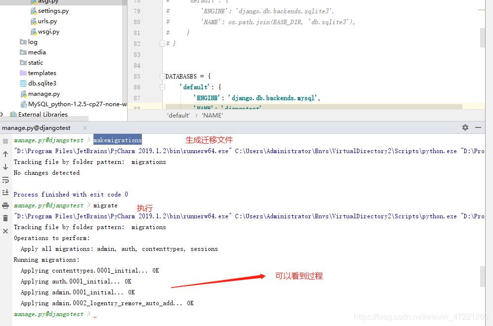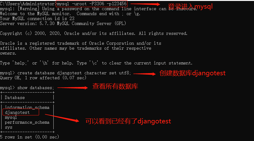 我就在本机的mysql上创建一个数据库,命名为djangotest:create database djangotest character set utf8;