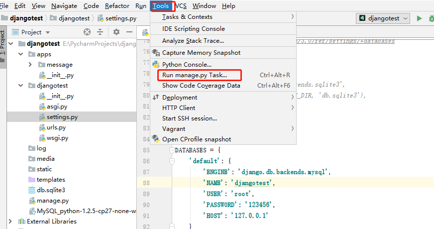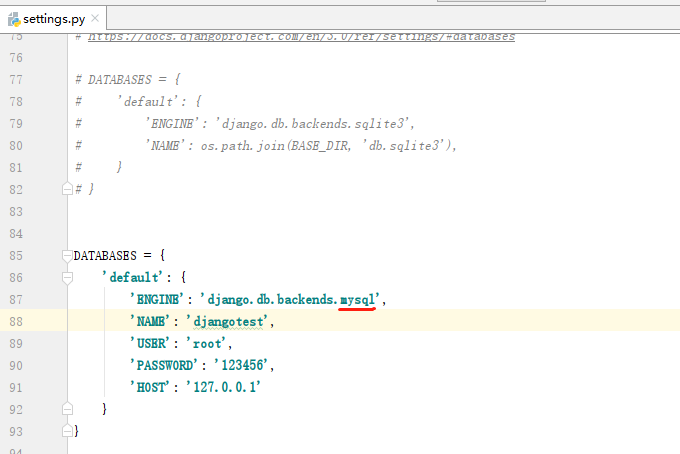 2.在django库的settings.py文件里配置连接刚才创建的数据库