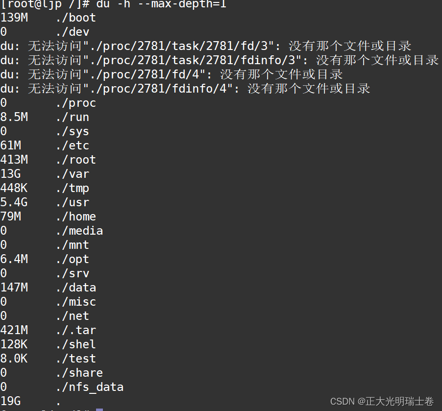 输入命令du -h --max-depth=1 寻找当前目录,哪个文件夹占用空间最大(处于根目录)