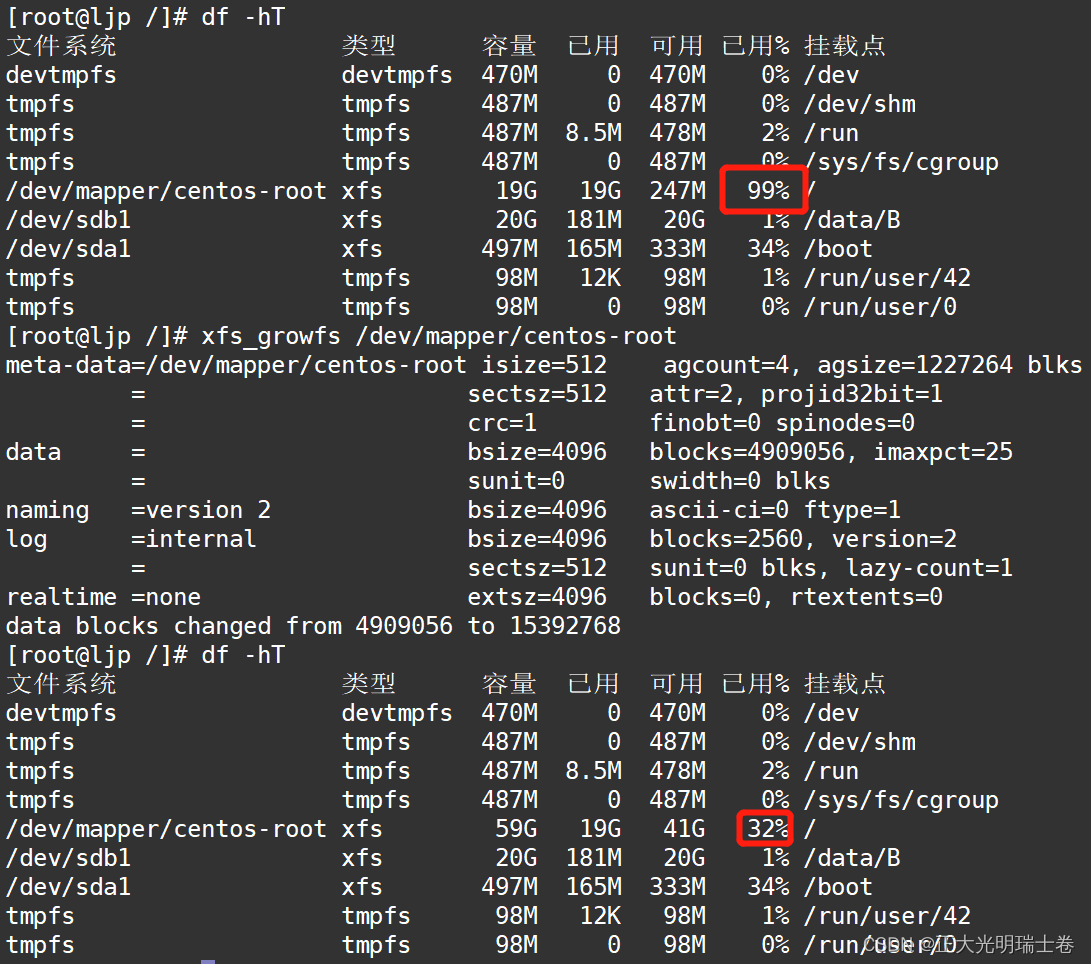 Logical volume centos/root successfully resized.xfs_growfs /dev/mapper/centos-root