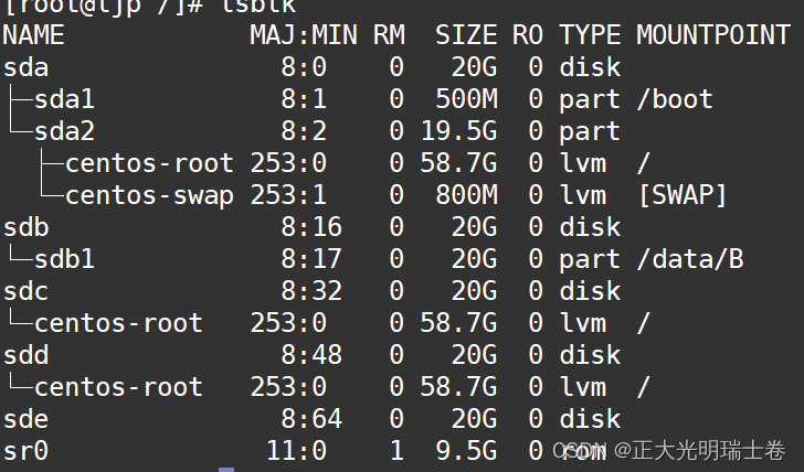 使用lsblk、fdisk -l命令我们发现,爆满的磁盘属于/dev/sda,/dev/centos/root的逻辑分区