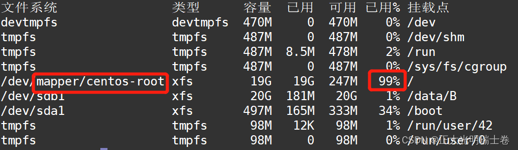 可以看到,挂载在根目录的的硬盘已经快要”爆炸“了,为了系统的正常运行,急需处理这样的情况,正常情况下,如果某个位置的占用过高,可以通过删除其中”重量级“不是那么重要的文件来缓解这样的情况