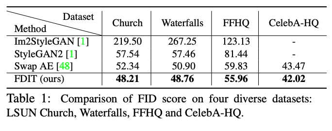 We show in Table 1 that FDIT can substantially improve the image quality while preserving the image content. We adopt the Frechet Inception Distance (FID) [23] as the measure of image quality. Small values indicate better image quality. Details about Im2StyleGAN [1] and StyleGAN2 [1] are shown in the supplementary material. FDIT achieves the lowest FID across all datasets. On average, FDIT could reduce the FID score by 5.6% compared to the current state-of-the-art method.