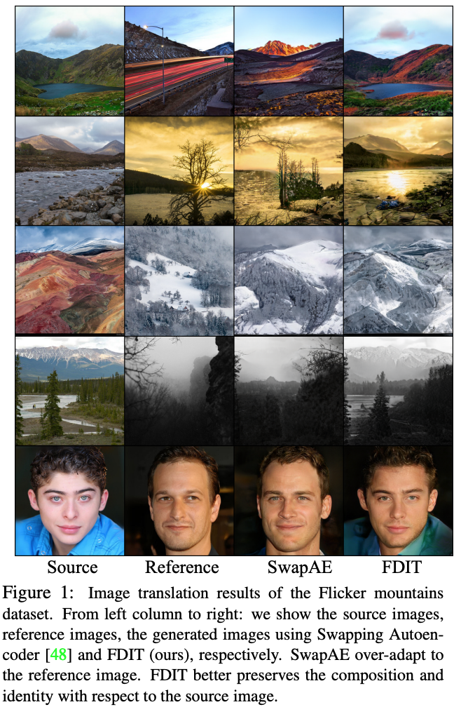 We contrast the image translation performance using FDIT vs. vanilla SwapAE in Figure 1 and Figure 5. The vanilla SwapAE is unable to preserve the important identityof the source images, and over-adapts to the reference image. For example, the face identity is completely switched after translation, as seen in rows 4 of Figure 5. SwapAE also fails to preserve the outline and the local sharp edgesin the source image. As shown in Figure 1, the outlines of the mountains are severely distorted. Besides, the overall image composition has a large shift fromthe original source image.