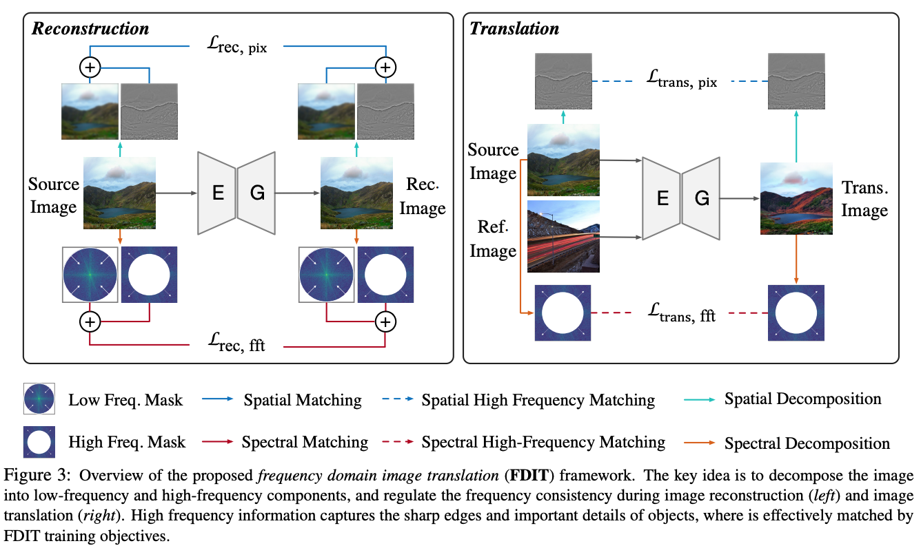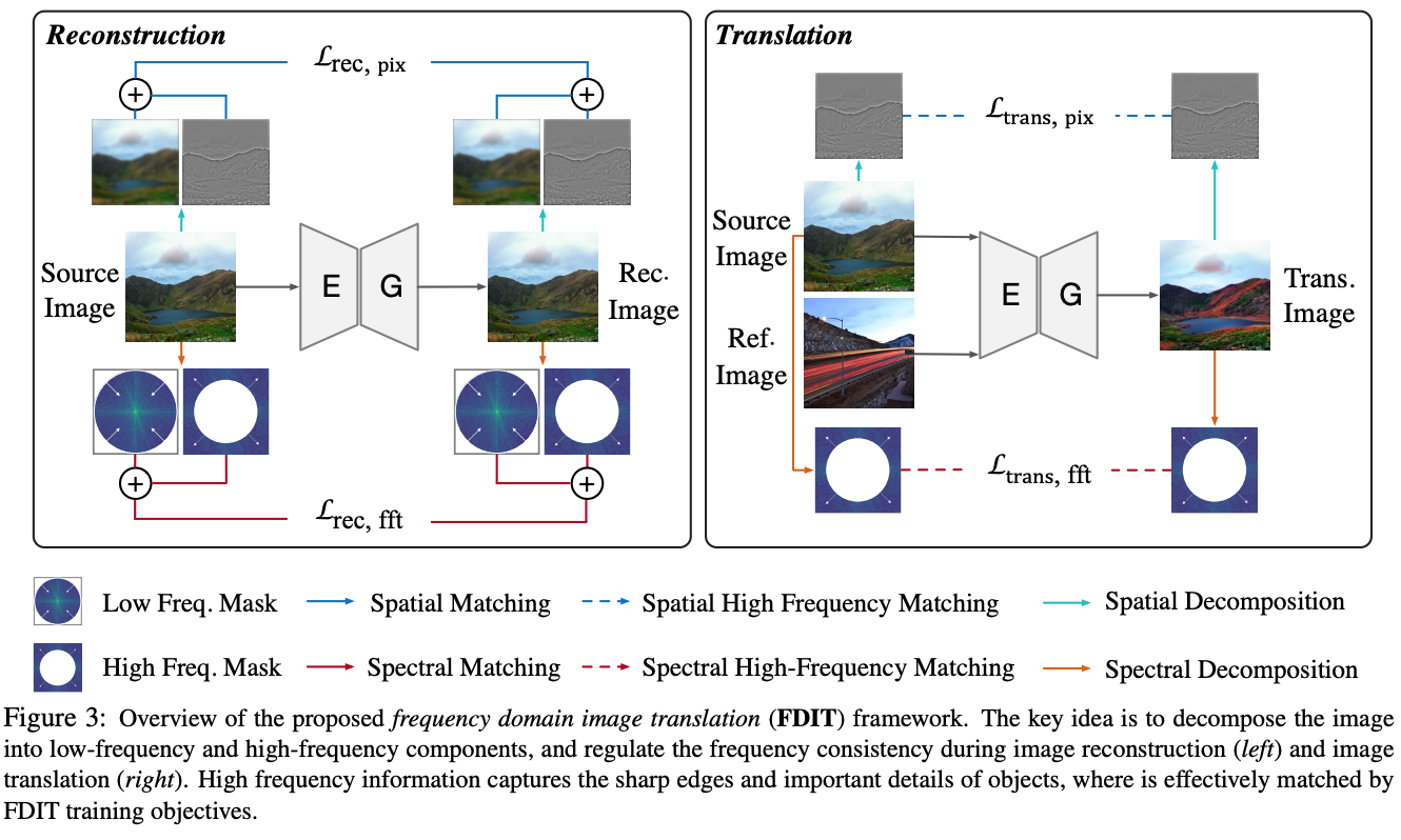Our key idea is to decompose the image into lowand high-frequency components, and regulate the frequency consistency during image translation.