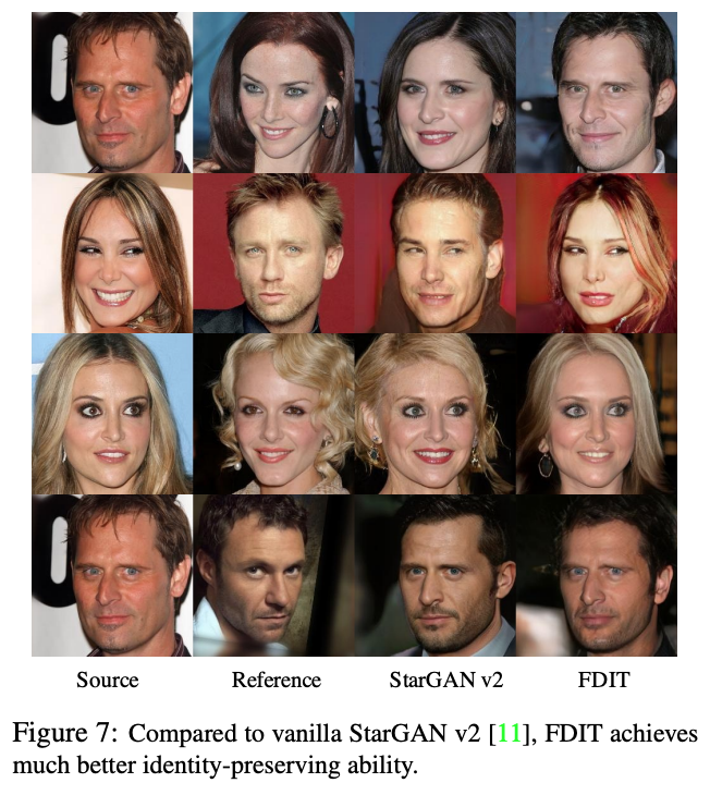 First, FDIT can highly preserve the gender identity; whereas the vanilla StarGAN v2 model would change the resulting gender according to the reference image (e.g. first and second row).