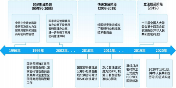 我国商用密码的发展起步起源于20世纪90年代开启的“金字”工程。正是随着一系列信息化工程的实施,国家对信息技术应用的要求不断提高,信息化成为一项全局性战略,在经济社会各个领域全面推进。在此背景下,信息安全保护的紧迫性日益凸显,商用密码的应用需求应运而生。商用密码技术、产品开始出现,在各个行业开始得到初步应用。