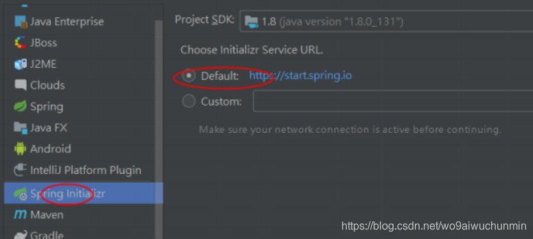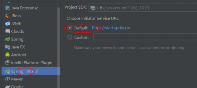 - 选择Spring Initializr,Initializr默认选择Default,点击Next