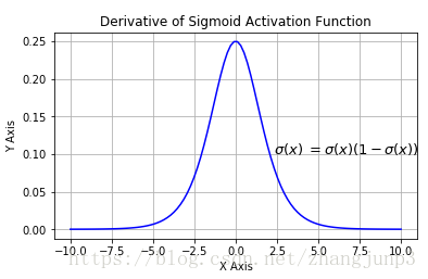 可以看到最后一层反向传播时,所求的梯度中都要乘以sigmoid的导数,而sigmoid的导数的图像如下,当神经元输出接近1时候,Sigmoid的导数就会很小,这样