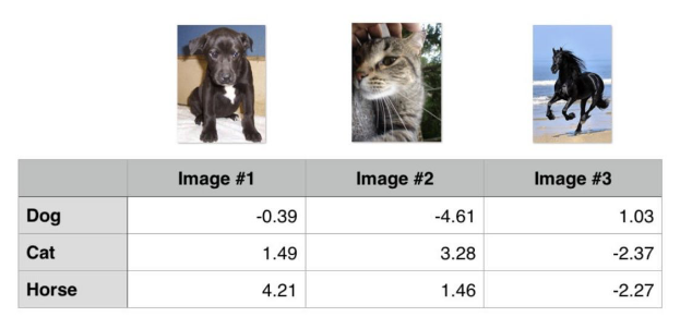 思考下例,我们有三个训练样本,要预测三个类别(狗、猫和马)。以下是我们通过算法预测出来的000每一类的值: