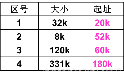 下一个分区为区号4的空闲分区,满足30k的是区号为4的空分区,大小-30k,起始地址+30k