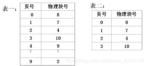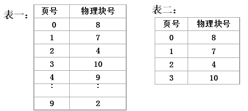 设有一单纯分页系统,页的大小为1KB。假定一进程的代码段长度为10页,页表如表一所示,快表如表二所示: