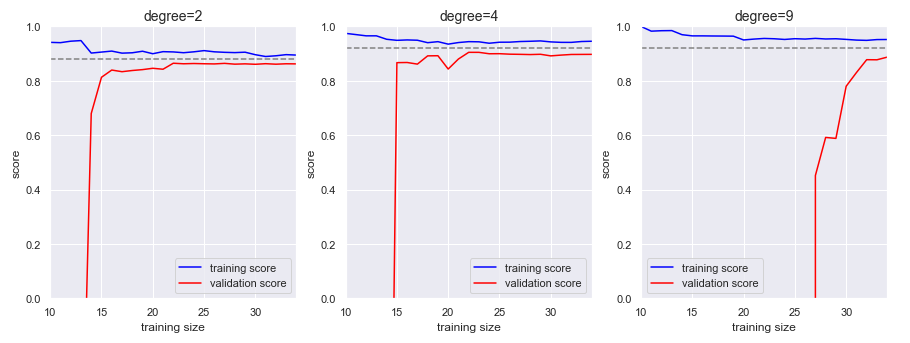 ②特定复杂度的模型对较大的数据集容易欠拟合(随着数据的增大,训练得分不断降低,验证得分不断升高)