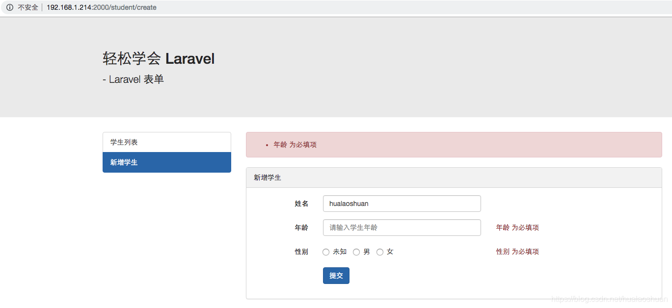 resources/views/student/create.blade.php中引入resources/views/common/validator.blade.php,并对错误信息的显示、数据保持进行处理