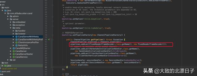- 处理TCP的粘包、拆包问题,这里我们需要了解,canal_server的实现,内部使用netty提供网络服务,netty采用固定包头(4字节)第四个字节表示包体长度+包体进行包处理,这里需要去看一下下面的代码,那么我们在client进行相应的解包的时候就需要注意了,先要去除包头的内容,再去获取包体内容,然后再反序列化奥