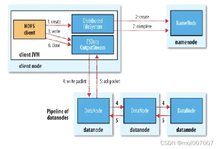 个DataNode建立tcp连接,这些连接链路被称为“pipline”,最后会形成一个完成文件返回给Client。