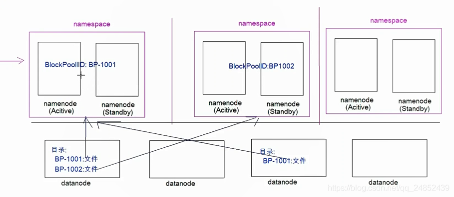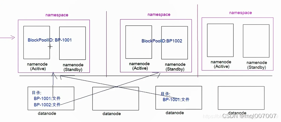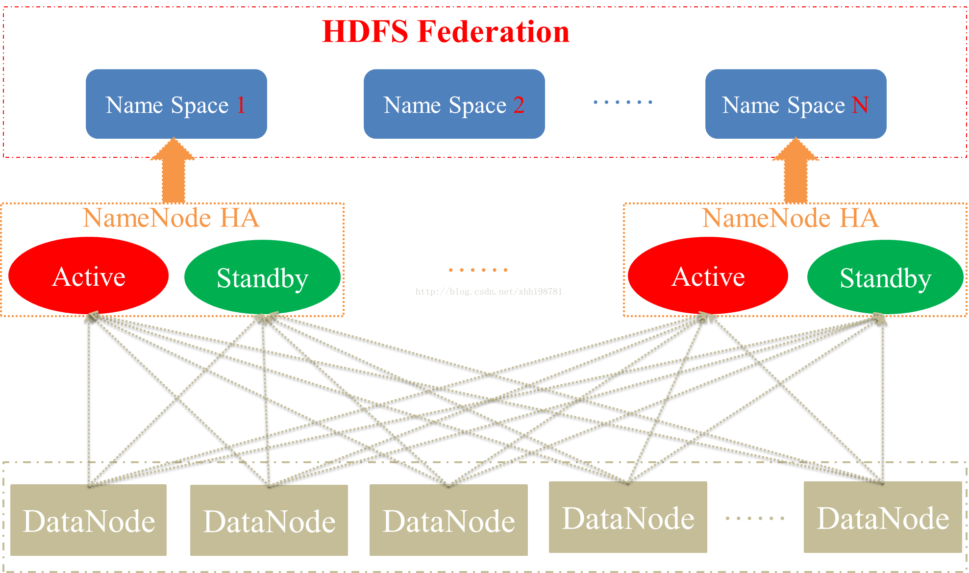 NameNode Federation:NameNode分区分布且共享DataNode,保证命名服务容量不受限