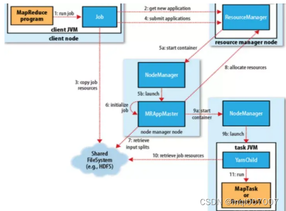 7) 各个任务通过某个 RPC 协议向 ApplicationMaster 汇报自己的状态和进度 , 让 ApplicationMaster 随时掌握各个任务的运行状态 , 从而可以在任务失败时重新启动任务 , 在应用程序运行过程中 , 用户可以随时通过 RPC 向 ApplicationMaster 查询应用程序的当前运行状态 .