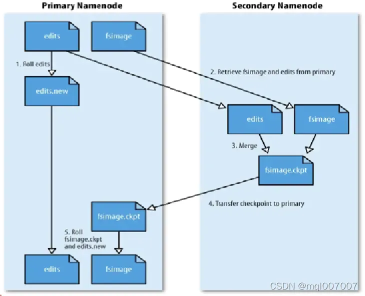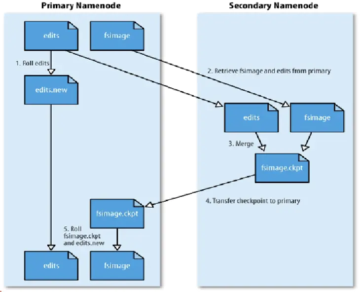 任何对文件系统元数据产生修改的操作,Namenode都会在内存中保存,同时会在磁盘上保存两个元数据管理文件来,FsImage(镜像文件) 和 EditsLog(编辑日志),起到防止数据丢失和快速回复数据的作用。