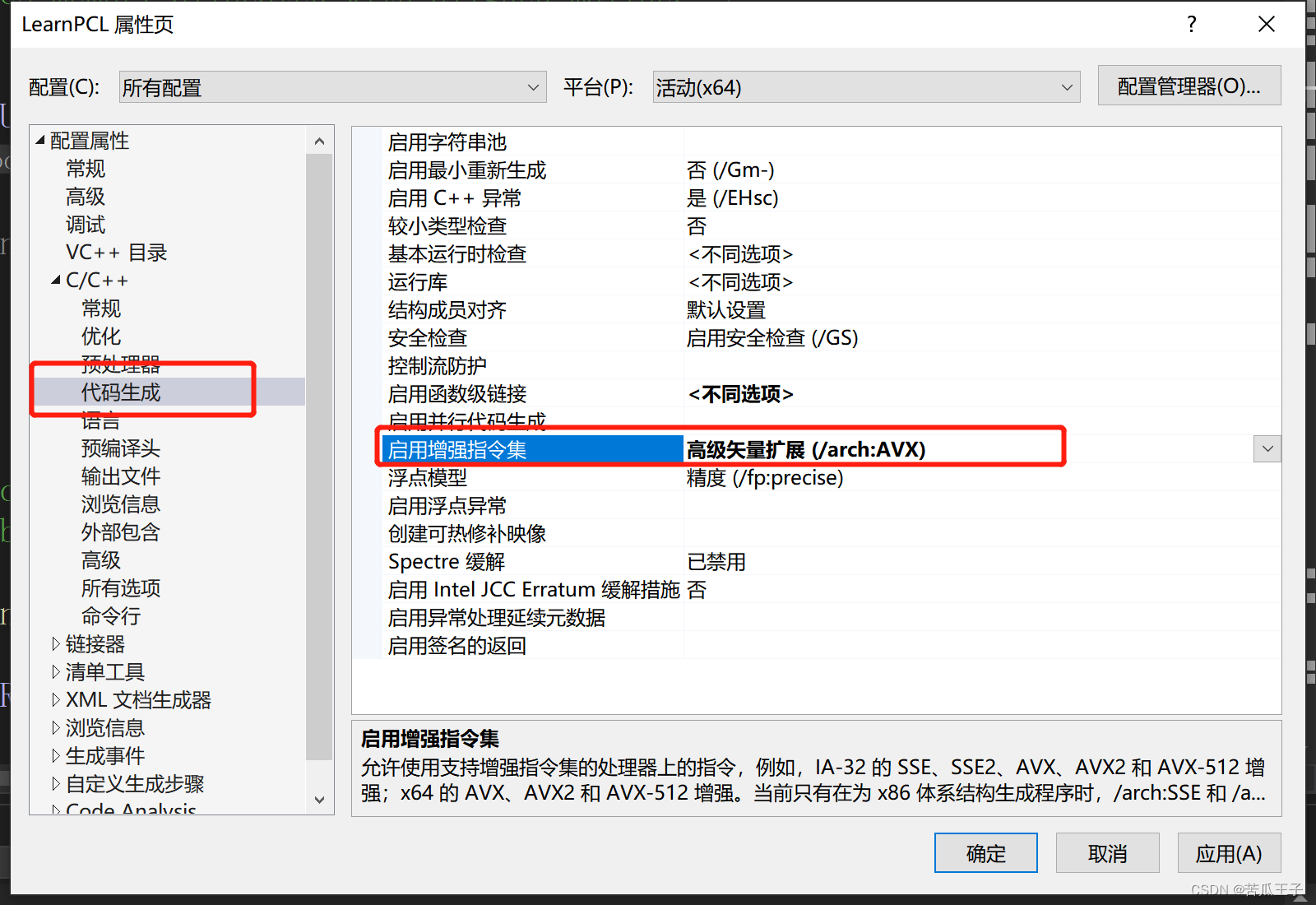 下面记录这个bug在win10+VS的解决方案:在VS自己的项目的属性页,将启用增强指令集改为图中所示即可。
