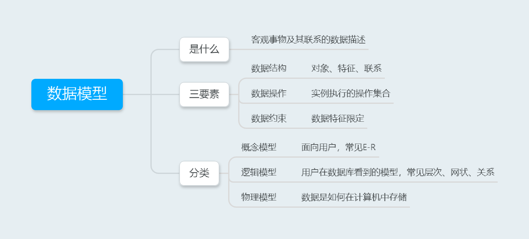 包括应用所涉及的对象、对象具有的特征和对象间的联系。是对数据库静态特征的描述。 - 数据操作: