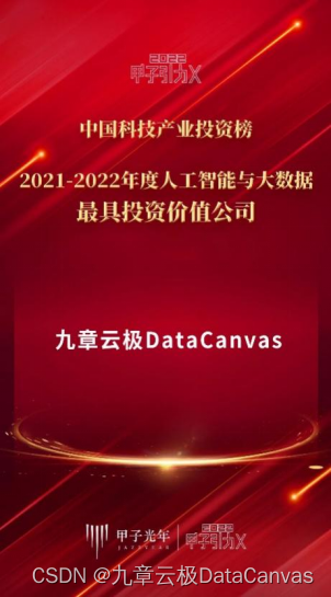 近日,2022「甲子引力 X」科技产业投资峰会成功举办,峰会现场发布了“ 2021-2022 中国科技产业投资榜”,九章云极DataCanvas公司凭借领先的技术创新实力和数据智能基础软件产品的大规模成功商用获评“2021-2022年度人工智能与大数据最具投资价值公司”。