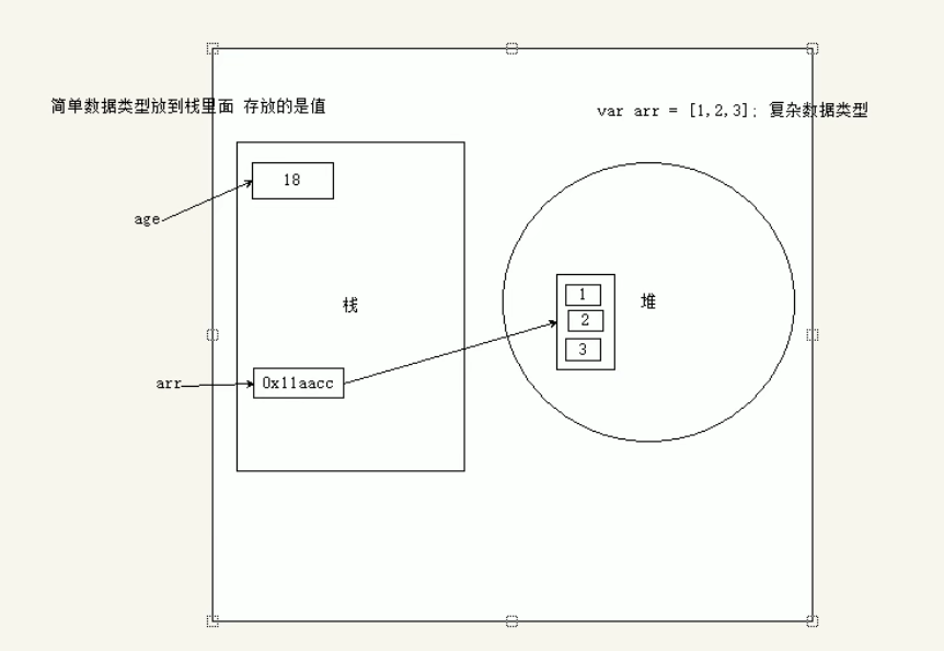 - 复杂数据类型,首先在栈里面存放地址(十六进制表示),然后这个地址指向堆里面的数据。