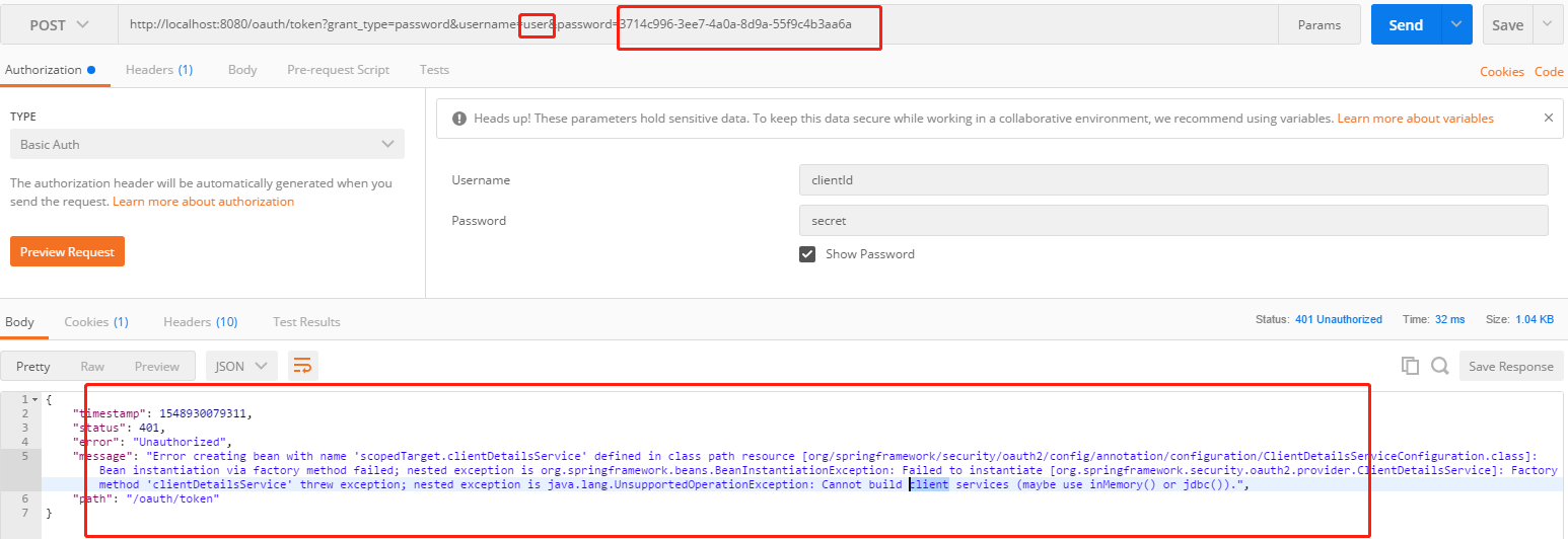 上面请求中的username默认是user,password去启动日志中能看到,结果看到报了如下错误。