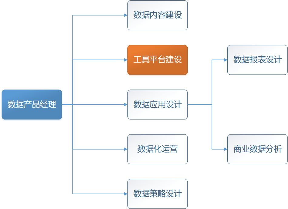 数据产品经理按照其工作内容,可以分为工具型数据产品经理、应用型数据产品经理和数据内容建设型数据产品经理、运营型数据产品经理和策略型数据产品经理。其中数据应用型产品经理,又可分为数据报表设计和商业数据分析型数据产品经理,两个子分类。详细的划分结构如下图所示: