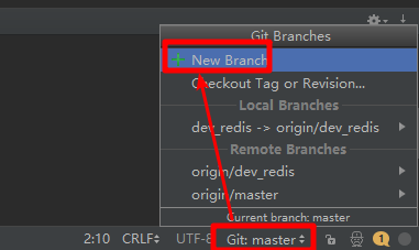 点击Idea右下角的git状态栏,然后选择New Branch,设置一个分支的名称dev_redis
