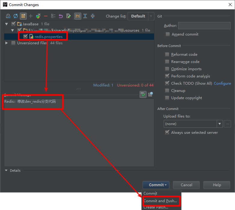 2.然后在分支代码中改动一个文件,然后commit提交代码到本地仓库,接着push到远程dev_redis分支