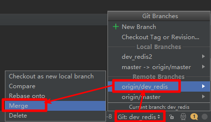 选择远程分支Remote Branches下的dev_redis分支,并选择Merge