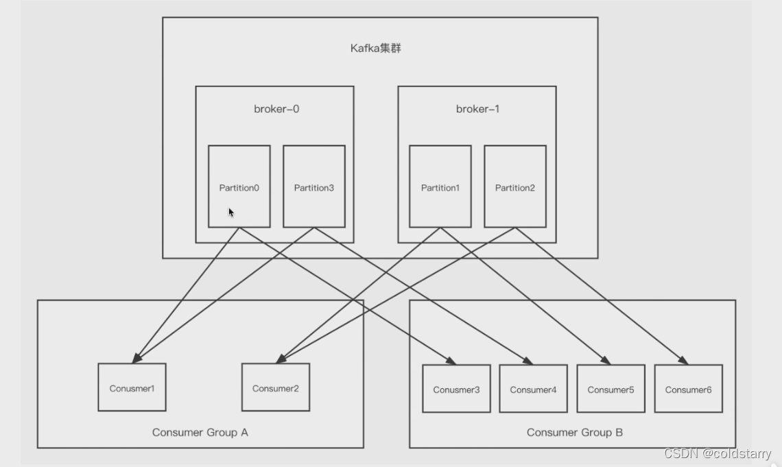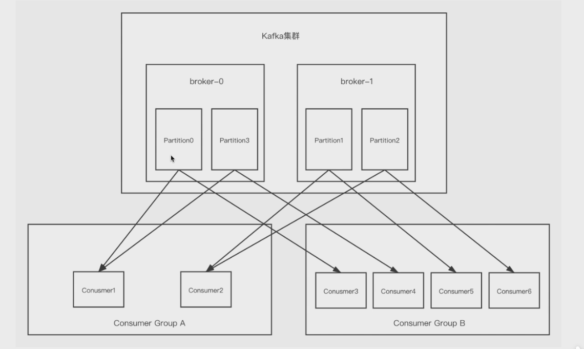 图中集群有两个Broker,每个broker有多个Partition,一个partition只能被一个消费组的某一个消费者消费,从而保证消费顺序。kafka只在partition的范围内保证消息消费的局部顺序性,不能在同一个topic中多个partition中保证总体的消费顺序性,一个消费者可以消费多个partition