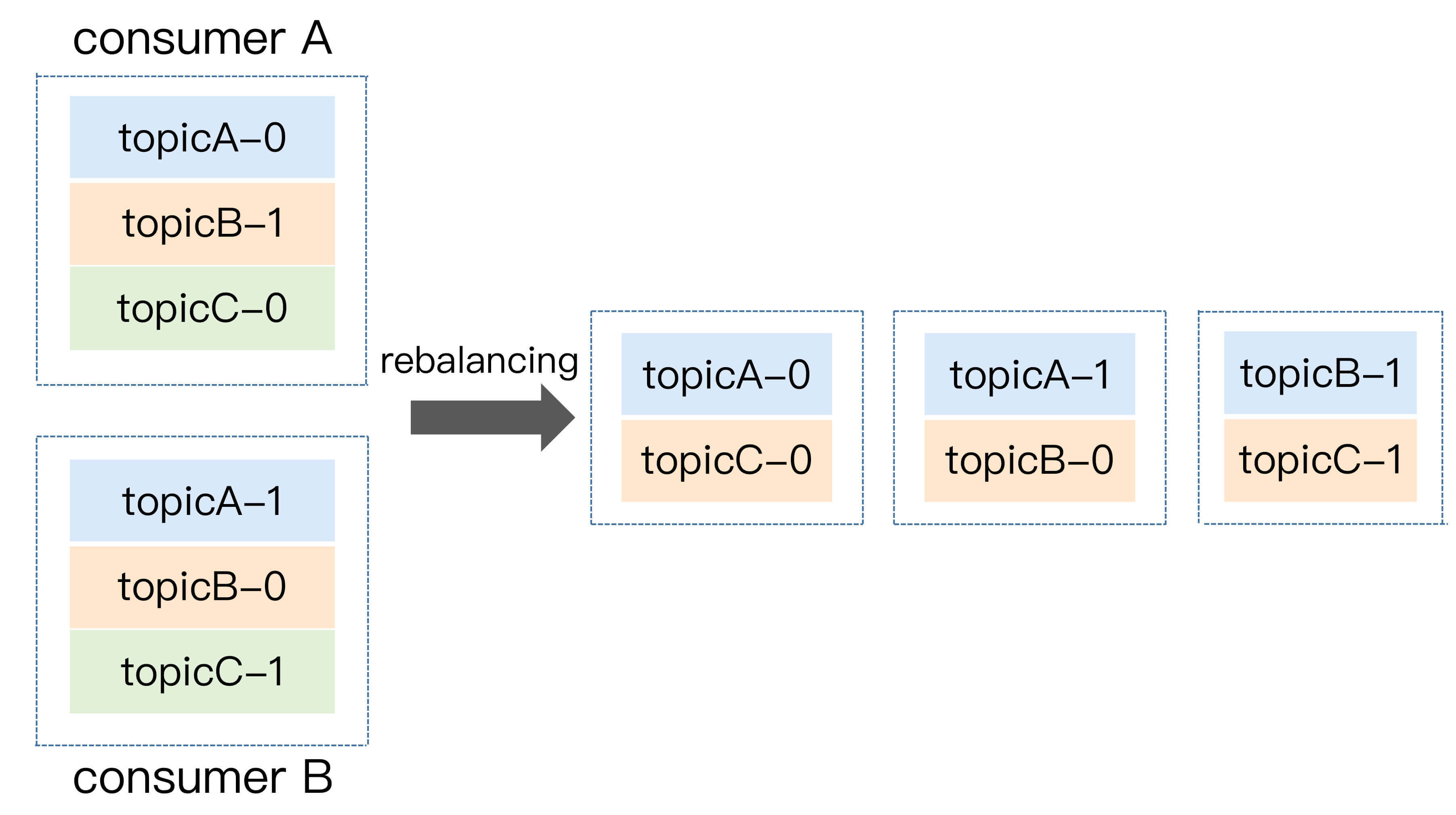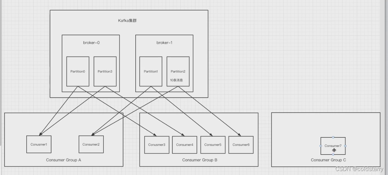 消费组中的消费者数量不能比一个topic的partition数量多,否则多出来的那个消费者无法消费到消息,比如下图有4个partition,如果group b中再多出一个消费者consumer 7,这个消费者将无法消费到消息。但如果其中一个消费者挂了,会触发rebalance机制,会让其他的消费者消费该分区