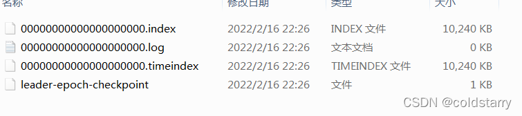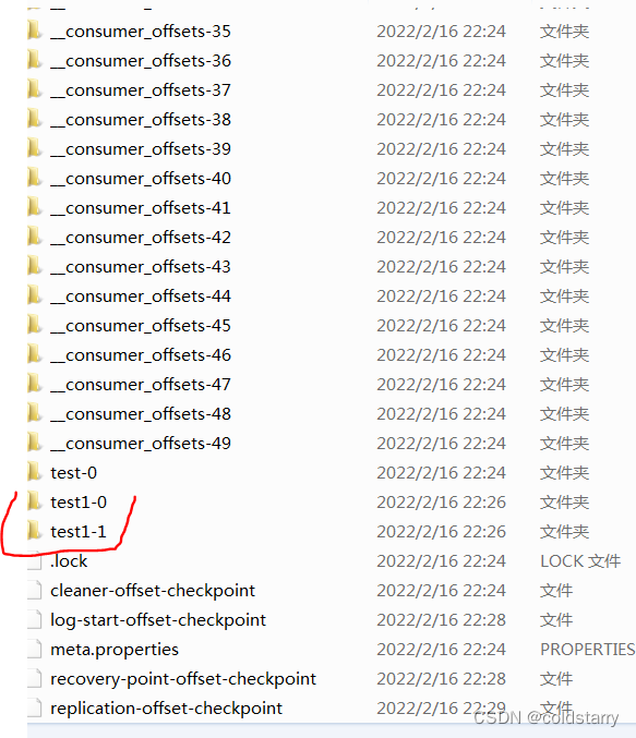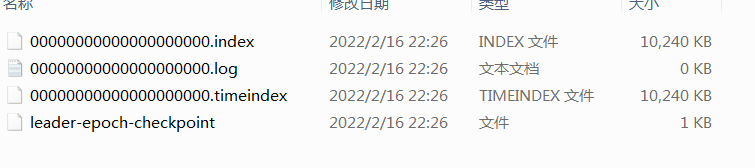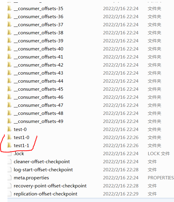 有2个文件夹,代表刚刚建立的test1的topic的2个分区,打开test-0文件夹内: