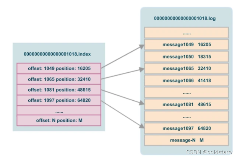 通过dump index我们发现索引文件中其实就保存了offset和position,分别是消息的offset也就是具体那一条消息,position表示具体消息存储在log中的物理地址,例如: