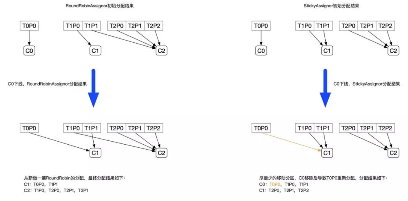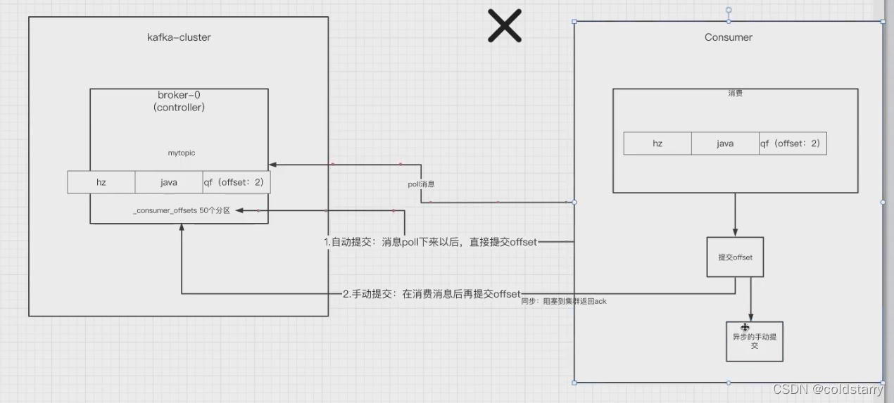 每个消费者会定期将自己消费分区的offset提交给kafka内部topic:__consumer_offsets,提交过去的时候,key是consumerGroupId+topic+分区号,value就是当前offset的值,kafka会定期清理topic里的消息,最后就保留最新的那条数据因为__consumer_offsets可能会接收高并发的请求,kafka默认给其分配50个分区(可以通过offsets.topic.num.partitions设置),这样可以通过加机器的方式抗大并发。通过如下公式可以选出consumer消费的offset要提交到__consumer_offsets的哪个分区,公式:hash(consumerGroupId) % __consumer_offsets主题的分区数