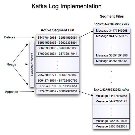 Segment由多个不可变的记录组成,记录只会被append到Segment中,不会被单独删除或者修改,每个Segment中的Message数量不一定相等