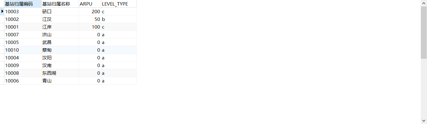 2.统计统计每个基站归属的消费金额,并且根据金额划分等级(0-50 为 a,50-100 为b ,100及以上为c)。字段要求:基站归属编码,基站归属名称,合计金额,等级。