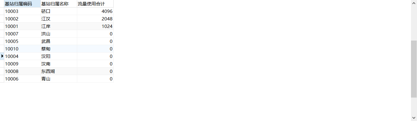 3.统计每个基站的流量使用情况:基站归属编码,基站归属名称,流量使用合计。